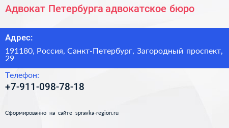Адвокат Петербурга, адвокатское бюро по адресу 191180, Россия, Санкт-Петербург, Загородный проспект, 29 в дальнейшем Организация, размещена в следующих категориях: