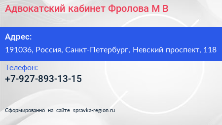 Адвокатский кабинет Фролова М.В. по адресу 191036, Россия, Санкт-Петербург, Невский проспект, 118 в дальнейшем Организация, размещена в следующих категориях: