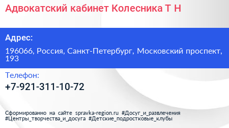 Адвокатский кабинет Колесника Т.Н. по адресу 196066, Россия, Санкт-Петербург, Московский проспект, 193 в дальнейшем Организация, размещена в следующих категориях: