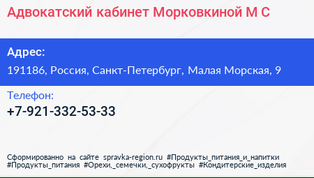Адвокатский кабинет Морковкиной М.С. по адресу 191186, Россия, Санкт-Петербург, Малая Морская, 9 в дальнейшем Организация, размещена в следующих категориях: