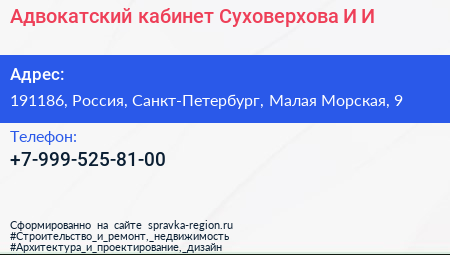 Адвокатский кабинет Суховерхова И.И. по адресу 191186, Россия, Санкт-Петербург, Малая Морская, 9 в дальнейшем Организация, размещена в следующих категориях:
