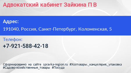 Адвокатский кабинет Зайкина П.В. по адресу 191040, Россия, Санкт-Петербург, Коломенская, 5 в дальнейшем Организация, размещена в следующих категориях: