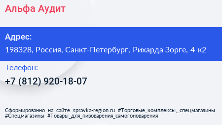 Альфа-Аудит по адресу 198328, Россия, Санкт-Петербург, Рихарда Зорге, 4 к2 в дальнейшем Организация, размещена в следующих категориях: