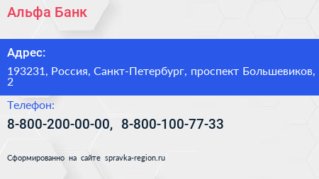 Альфа-Банк по адресу 193231, Россия, Санкт-Петербург, проспект Большевиков, 2 в дальнейшем Организация, размещена в следующих категориях: