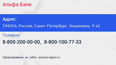 Альфа-Банк по адресу 194356, Россия, Санкт-Петербург, Хошимина, 9 к1 в дальнейшем Организация, размещена в следующих категориях: