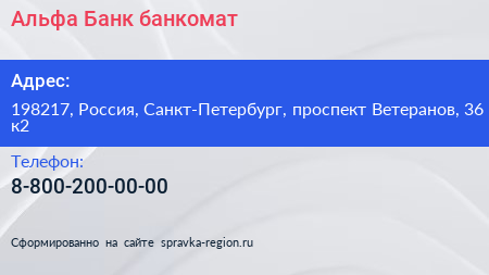 Альфа-Банк, банкомат по адресу 198217, Россия, Санкт-Петербург, проспект Ветеранов, 36 к2 в дальнейшем Организация, размещена в следующих категориях: