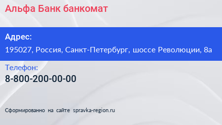 Альфа-Банк, банкомат по адресу 195027, Россия, Санкт-Петербург, шоссе Революции, 8а в дальнейшем Организация, размещена в следующих категориях: