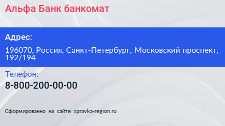 Альфа-Банк, банкомат по адресу 196070, Россия, Санкт-Петербург, Московский проспект, 192/194 в дальнейшем Организация, размещена в следующих категориях: