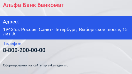 Альфа-Банк, банкомат по адресу 194355, Россия, Санкт-Петербург, Выборгское шоссе, 15 лит А в дальнейшем Организация, размещена в следующих категориях: