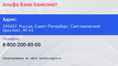 Альфа-Банк, банкомат по адресу 195427, Россия, Санкт-Петербург, Светлановский проспект, 40 к1 в дальнейшем Организация, размещена в следующих категориях: