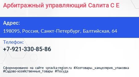Арбитражный управляющий Салита С.Е. по адресу 198095, Россия, Санкт-Петербург, Балтийская, 64 в дальнейшем Организация, размещена в следующих категориях: