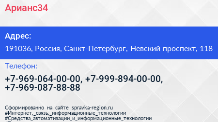 Арианс34 по адресу 191036, Россия, Санкт-Петербург, Невский проспект, 118 в дальнейшем Организация, размещена в следующих категориях: