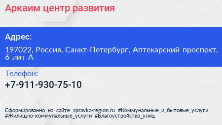Аркаим, центр развития по адресу 197022, Россия, Санкт-Петербург, Аптекарский проспект, 6 лит А в дальнейшем Организация, размещена в следующих категориях: