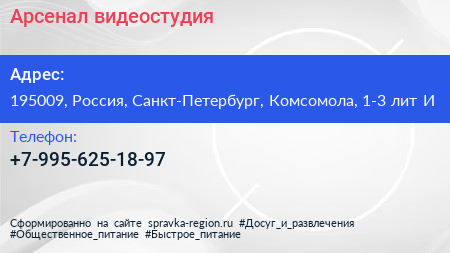 Арсенал, видеостудия по адресу 195009, Россия, Санкт-Петербург, Комсомола, 1-3 лит И в дальнейшем Организация, размещена в следующих категориях: