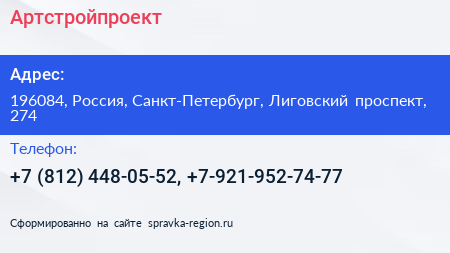 Артстройпроект по адресу 196084, Россия, Санкт-Петербург, Лиговский проспект, 274 в дальнейшем Организация, размещена в следующих категориях: