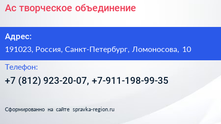 Ас, творческое объединение по адресу 191023, Россия, Санкт-Петербург, Ломоносова, 10 в дальнейшем Организация, размещена в следующих категориях: