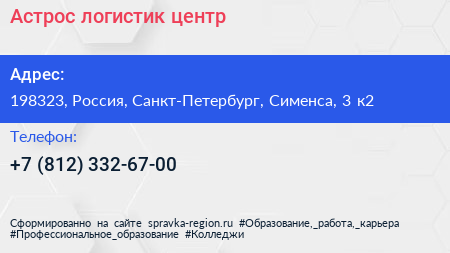 Астрос логистик центр по адресу 198323, Россия, Санкт-Петербург, Сименса, 3 к2 в дальнейшем Организация, размещена в следующих категориях: