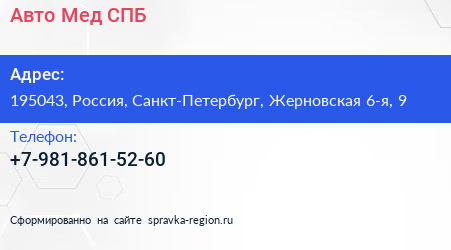 Авто Мед СПБ по адресу 195043, Россия, Санкт-Петербург, Жерновская 6-я, 9 в дальнейшем Организация, размещена в следующих категориях: