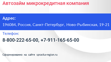 Автозайм, микрокредитная компания по адресу 196084, Россия, Санкт-Петербург, Ново-Рыбинская, 19-21 в дальнейшем Организация, размещена в следующих категориях: