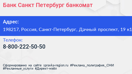 Банк Санкт-Петербург, банкомат по адресу 198217, Россия, Санкт-Петербург, Дачный проспект, 19 к1 в дальнейшем Организация, размещена в следующих категориях: