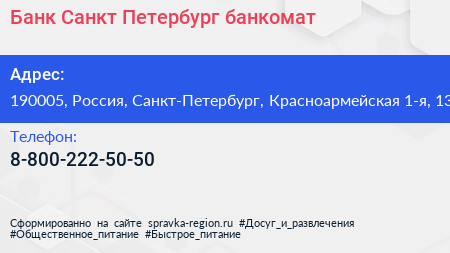 Банк Санкт-Петербург, банкомат по адресу 190005, Россия, Санкт-Петербург, Красноармейская 1-я, 13 в дальнейшем Организация, размещена в следующих категориях: