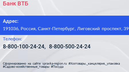 Банк ВТБ по адресу 191036, Россия, Санкт-Петербург, Лиговский проспект, 39 в дальнейшем Организация, размещена в следующих категориях: