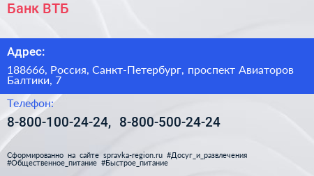 Банк ВТБ по адресу 188666, Россия, Санкт-Петербург, проспект Авиаторов Балтики, 7 в дальнейшем Организация, размещена в следующих категориях: