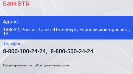 Банк ВТБ по адресу 188692, Россия, Санкт-Петербург, Европейский проспект, 16 в дальнейшем Организация, размещена в следующих категориях: