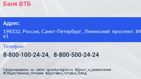 Банк ВТБ по адресу 198332, Россия, Санкт-Петербург, Ленинский проспект, 84 к1 в дальнейшем Организация, размещена в следующих категориях: