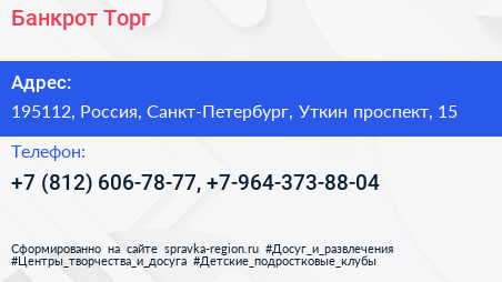 Банкрот-Торг по адресу 195112, Россия, Санкт-Петербург, Уткин проспект, 15 в дальнейшем Организация, размещена в следующих категориях: