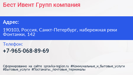 Бест Ивент Групп, компания по адресу 190103, Россия, Санкт-Петербург, набережная реки Фонтанки, 142 в дальнейшем Организация, размещена в следующих категориях: