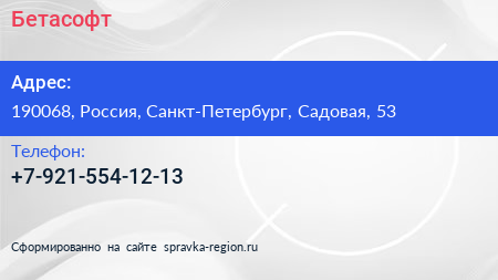 Бетасофт по адресу 190068, Россия, Санкт-Петербург, Садовая, 53 в дальнейшем Организация, размещена в следующих категориях: