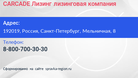 CARCADE Лизинг, лизинговая компания по адресу 192019, Россия, Санкт-Петербург, Мельничная, 8 в дальнейшем Организация, размещена в следующих категориях: