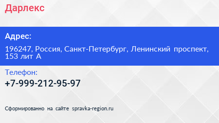 Дарлекс по адресу 196247, Россия, Санкт-Петербург, Ленинский проспект, 153 лит А в дальнейшем Организация, размещена в следующих категориях: