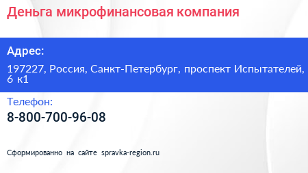 Деньга, микрофинансовая компания по адресу 197227, Россия, Санкт-Петербург, проспект Испытателей, 6 к1 в дальнейшем Организация, размещена в следующих категориях:
