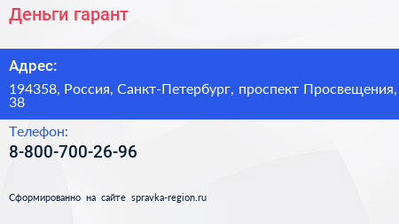 Деньги гарант по адресу 194358, Россия, Санкт-Петербург, проспект Просвещения, 38 в дальнейшем Организация, размещена в следующих категориях: