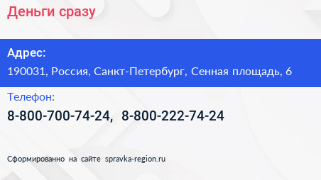 Деньги сразу по адресу 190031, Россия, Санкт-Петербург, Сенная площадь, 6 в дальнейшем Организация, размещена в следующих категориях: