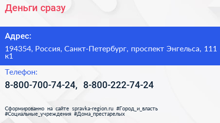 Деньги сразу по адресу 194354, Россия, Санкт-Петербург, проспект Энгельса, 111 к1 в дальнейшем Организация, размещена в следующих категориях:
