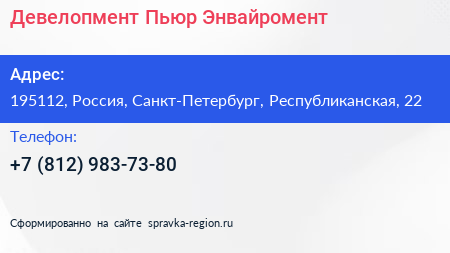 Девелопмент Пьюр Энвайромент по адресу 195112, Россия, Санкт-Петербург, Республиканская, 22 в дальнейшем Организация, размещена в следующих категориях:
