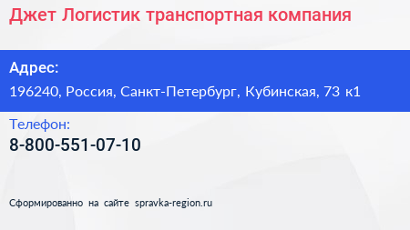 Джет Логистик, транспортная компания по адресу 196240, Россия, Санкт-Петербург, Кубинская, 73 к1 в дальнейшем Организация, размещена в следующих категориях: