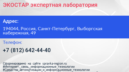 ЭКОСТАР, экспертная лаборатория по адресу 194044, Россия, Санкт-Петербург, Выборгская набережная, 49 в дальнейшем Организация, размещена в следующих категориях: