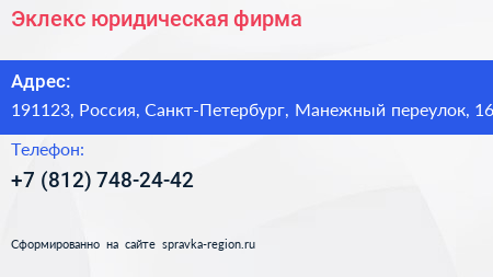 Эклекс, юридическая фирма по адресу 191123, Россия, Санкт-Петербург, Манежный переулок, 16 в дальнейшем Организация, размещена в следующих категориях: