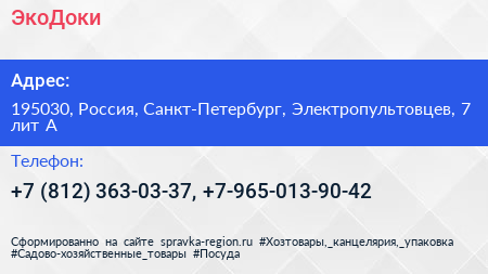ЭкоДоки по адресу 195030, Россия, Санкт-Петербург, Электропультовцев, 7 лит А в дальнейшем Организация, размещена в следующих категориях: