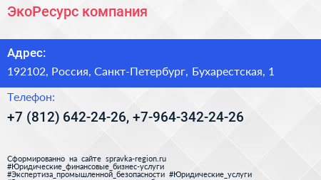 ЭкоРесурс, компания по адресу 192102, Россия, Санкт-Петербург, Бухарестская, 1 в дальнейшем Организация, размещена в следующих категориях: