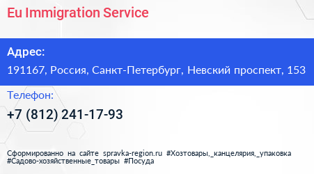 Eu Immigration Service по адресу 191167, Россия, Санкт-Петербург, Невский проспект, 153 в дальнейшем Организация, размещена в следующих категориях:
