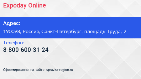 Expoday. Online по адресу 190098, Россия, Санкт-Петербург, площадь Труда, 2 в дальнейшем Организация, размещена в следующих категориях:
