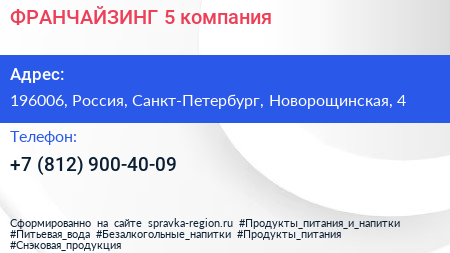 ФРАНЧАЙЗИНГ 5, компания по адресу 196006, Россия, Санкт-Петербург, Новорощинская, 4 в дальнейшем Организация, размещена в следующих категориях:
