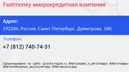 Fastmoney, микрокредитная компания по адресу 192286, Россия, Санкт-Петербург, Димитрова, 18Б в дальнейшем Организация, размещена в следующих категориях: