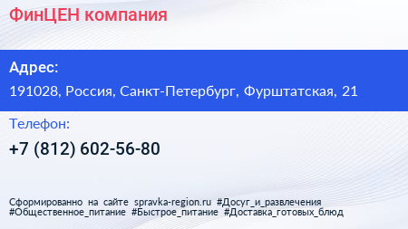 ФинЦЕН, компания по адресу 191028, Россия, Санкт-Петербург, Фурштатская, 21 в дальнейшем Организация, размещена в следующих категориях: