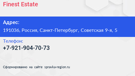 Finest Estate по адресу 191036, Россия, Санкт-Петербург, Советская 9-я, 5 в дальнейшем Организация, размещена в следующих категориях: